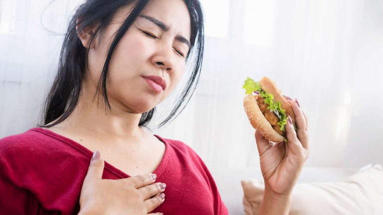 Heartburn happens when acid from your stomach moves up into your throat. This can cause a burning feeling in your chest, sour taste in your mouth, bad breath or extra burping.